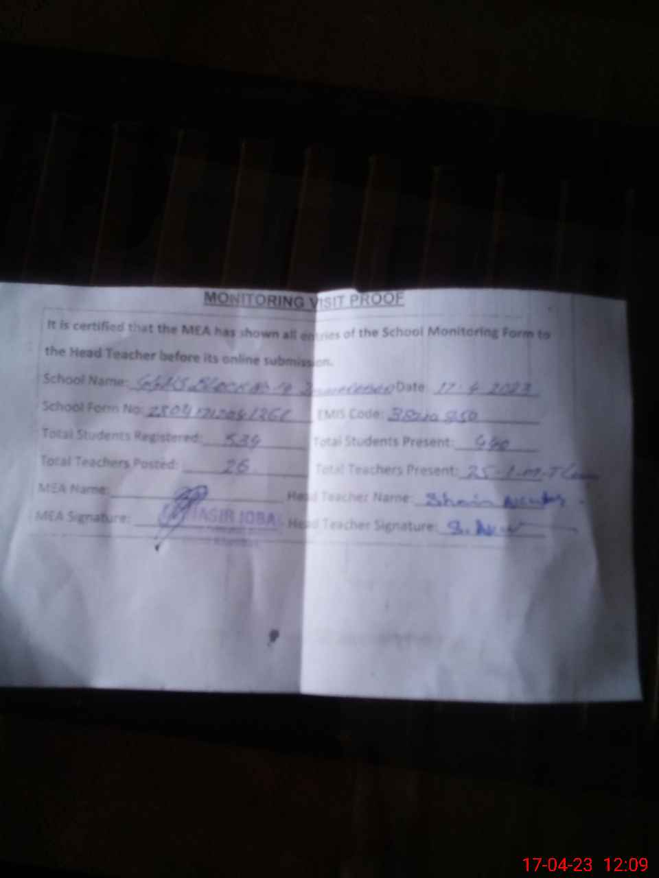 | Attendance Register | Head Teacher | MEA with School | Visit Proof |