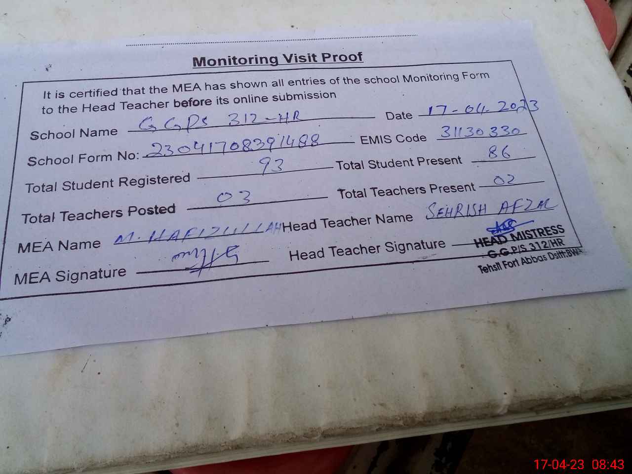 | Attendance Register | Head Teacher | MEA with School | Visit Proof |
