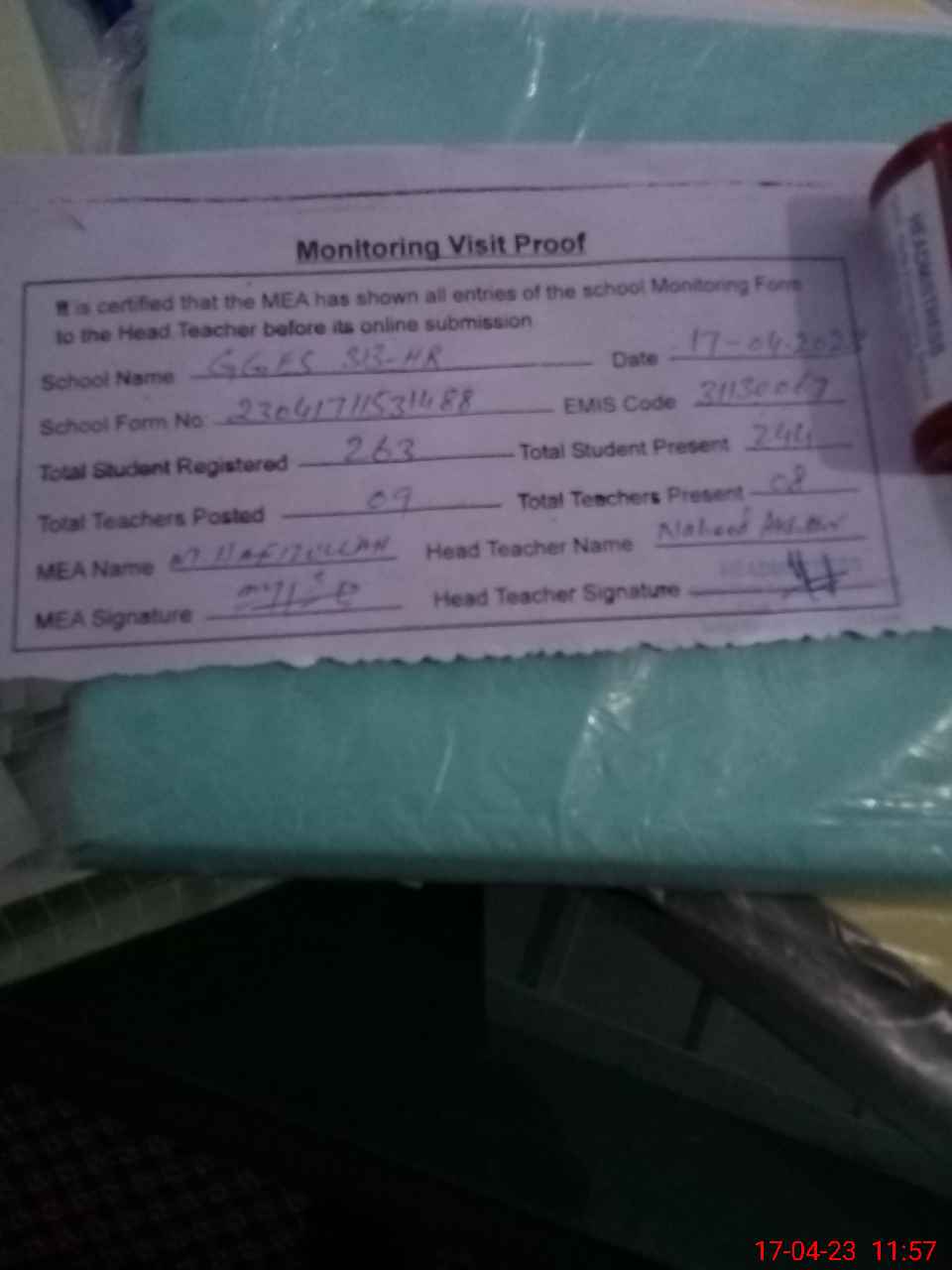 | Attendance Register | Head Teacher | MEA with School | Visit Proof |