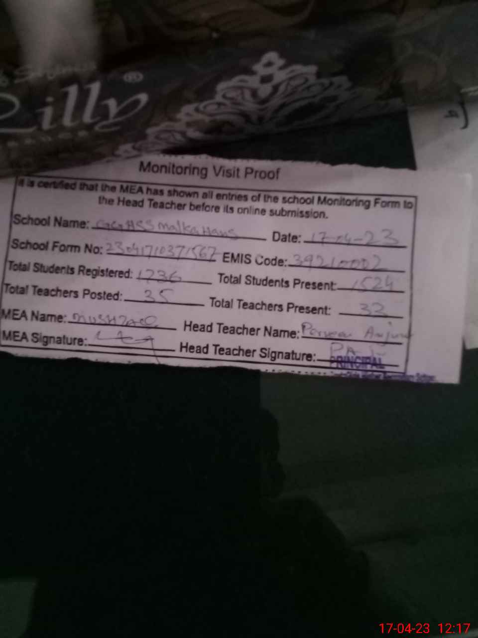 | Name: Pa**** An**** Designation: (School Headmaster's/Headmistress's) INCHARGE ,PRINCIPAL Phone/Cell Number: 03**** |