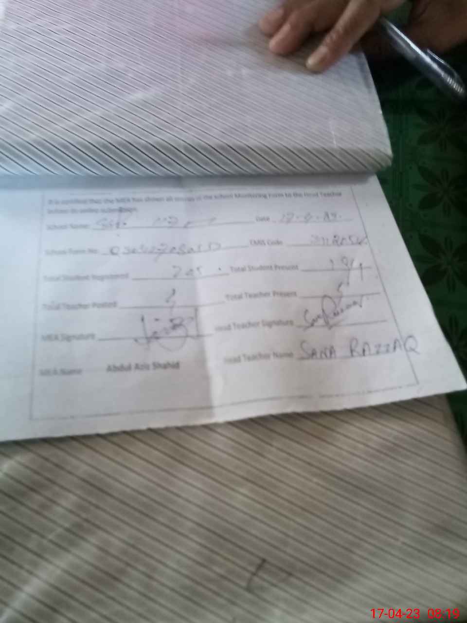 | Attendance Register | Head Teacher | MEA with School | Visit Proof |