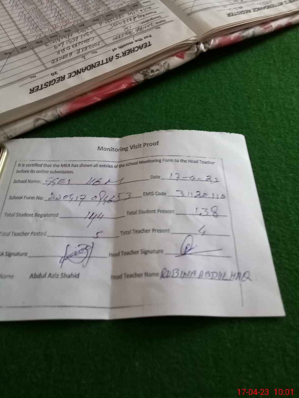 | Attendance Register | Head Teacher | MEA with School | Visit Proof |