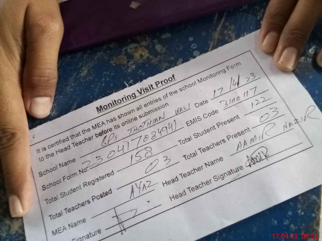 | Attendance Register | Head Teacher | MEA with School | Visit Proof |