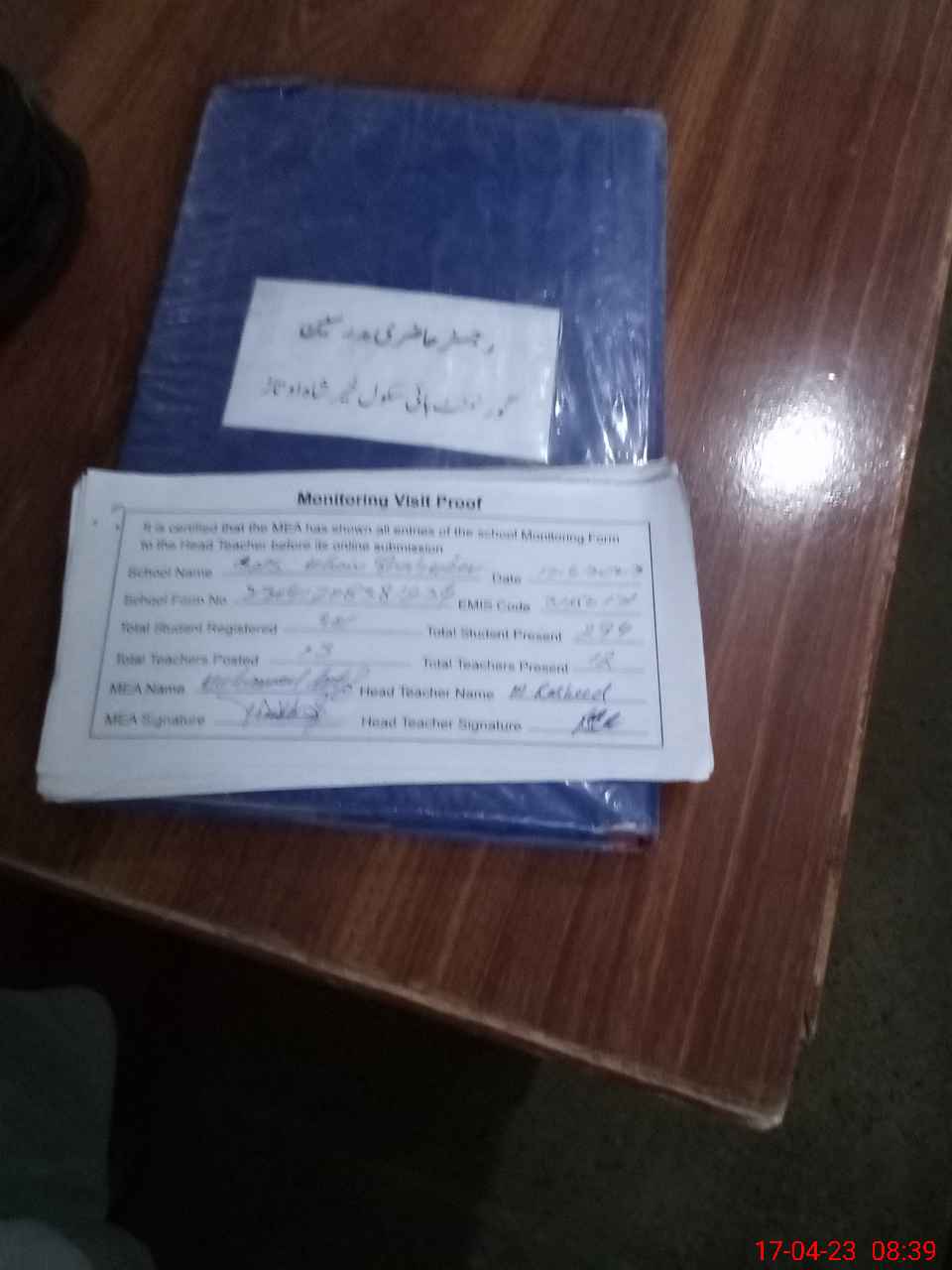 | Attendance Register | Head Teacher | MEA with School | Visit Proof |