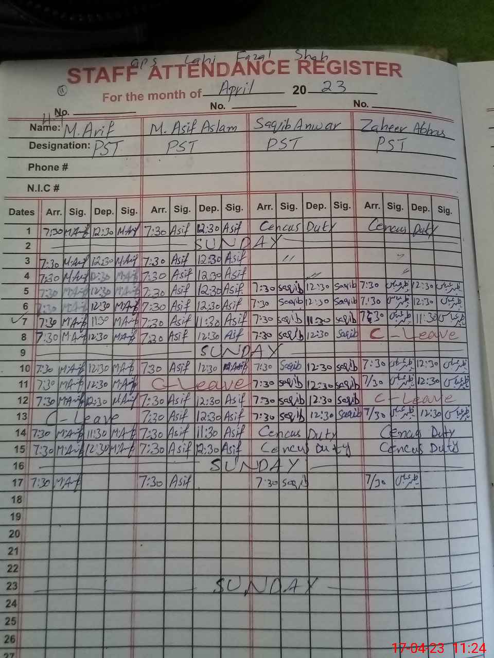 | CNIC | Full Name | Designation | R/C | Absence During Last Calender Month |