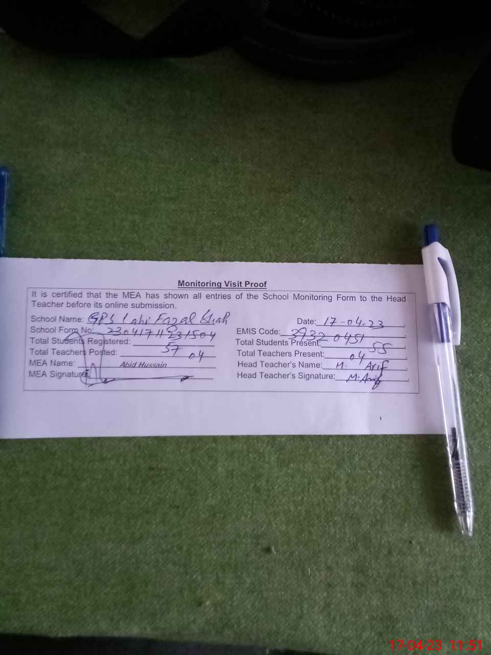 | Attendance Register | Head Teacher | MEA with School | Visit Proof |