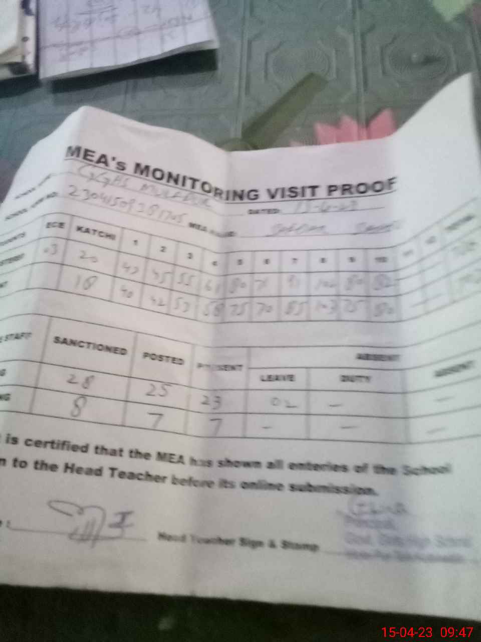 | Attendance Register | Head Teacher | MEA with School | Visit Proof |
