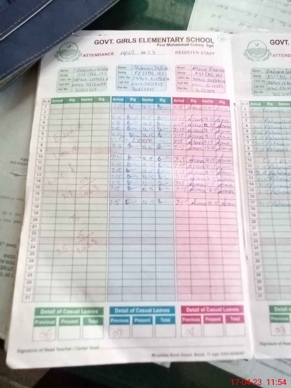 | CNIC | Full Name | Designation | R/C | Absence During Last Calender Month |