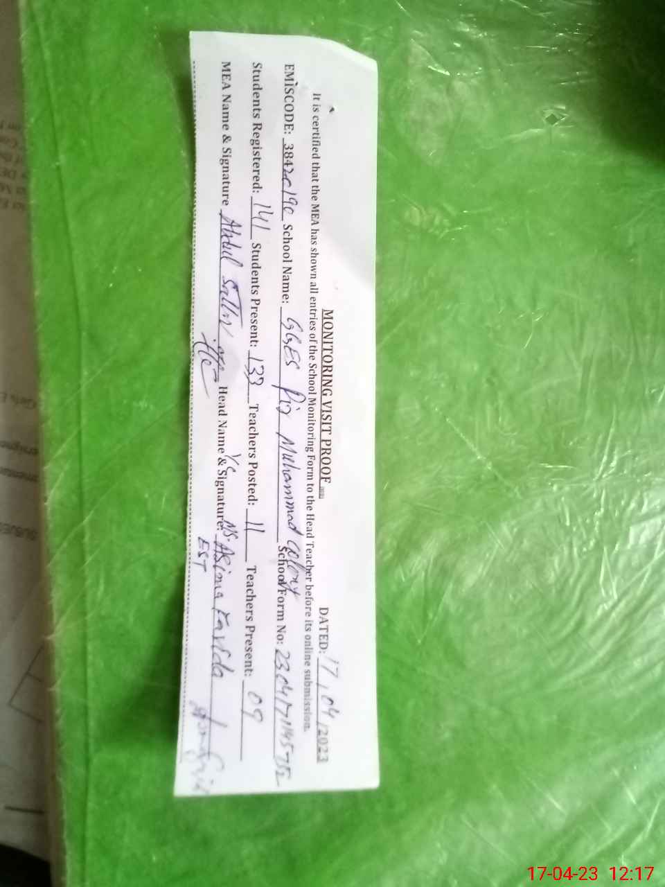 | Attendance Register | Head Teacher | MEA with School | Visit Proof |