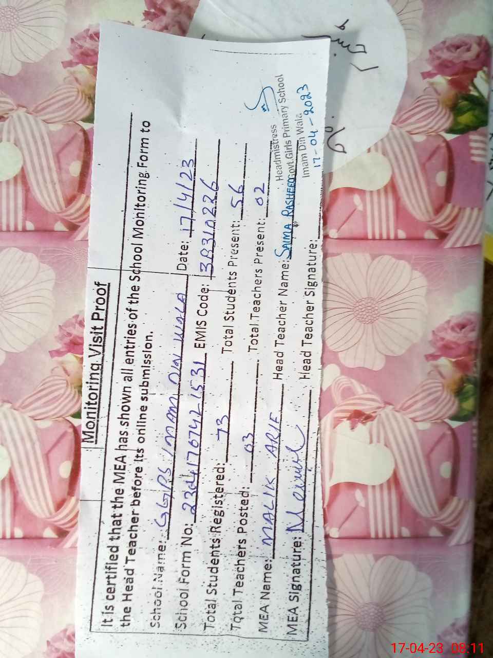 | Attendance Register | Head Teacher | MEA with School | Visit Proof |