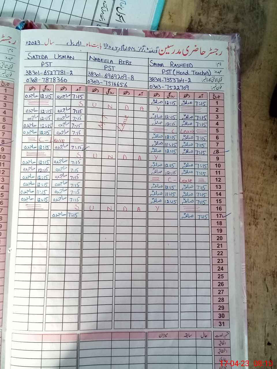| CNIC | Full Name | Designation | R/C | Absence During Last Calender Month |