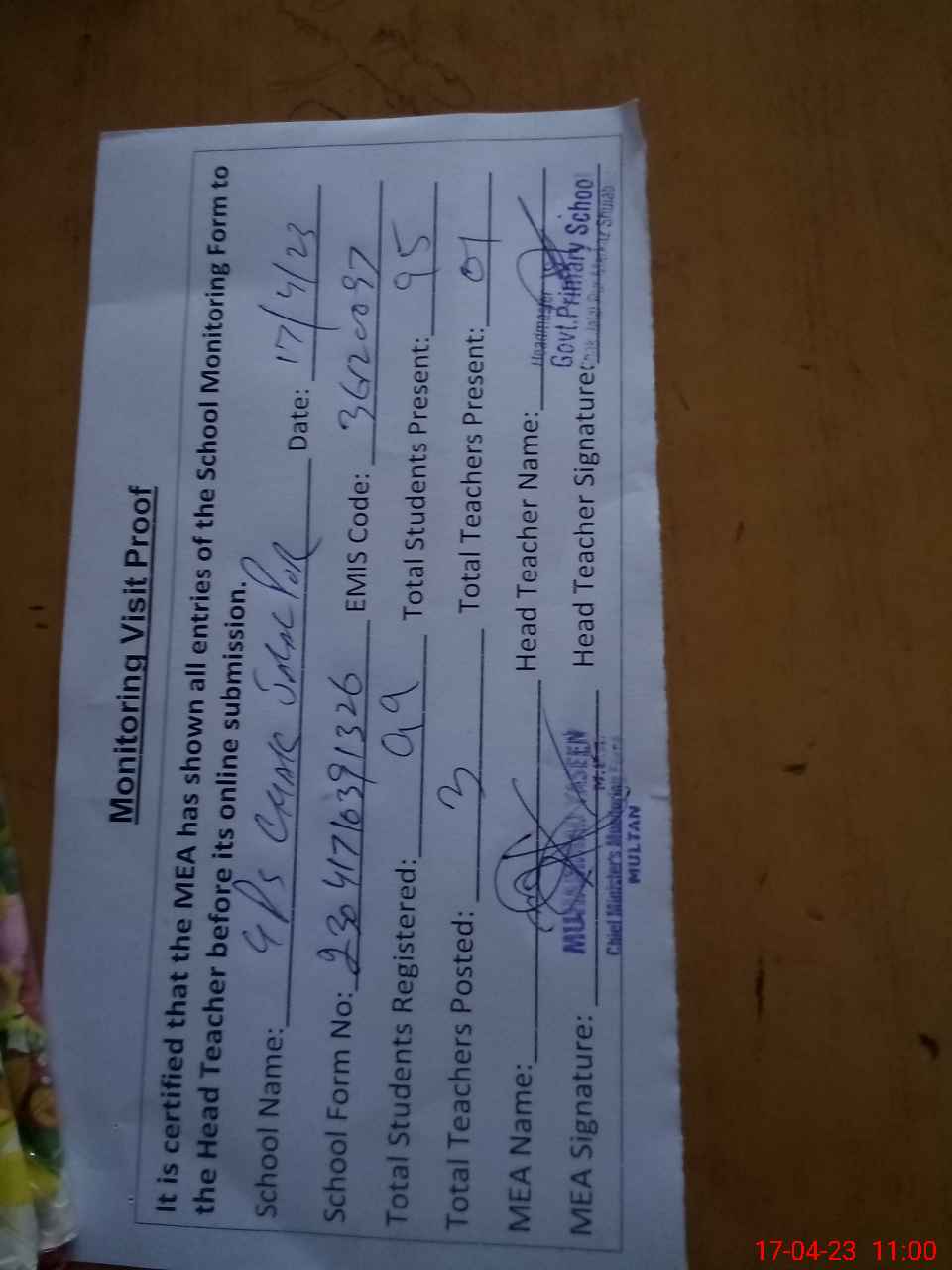 | Attendance Register | Head Teacher | MEA with School | Visit Proof |
