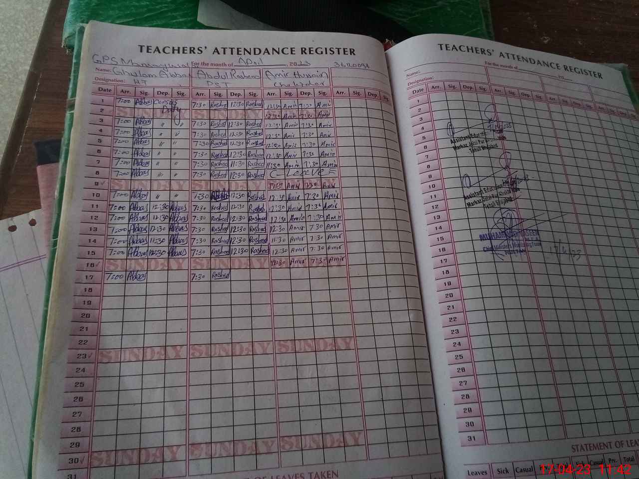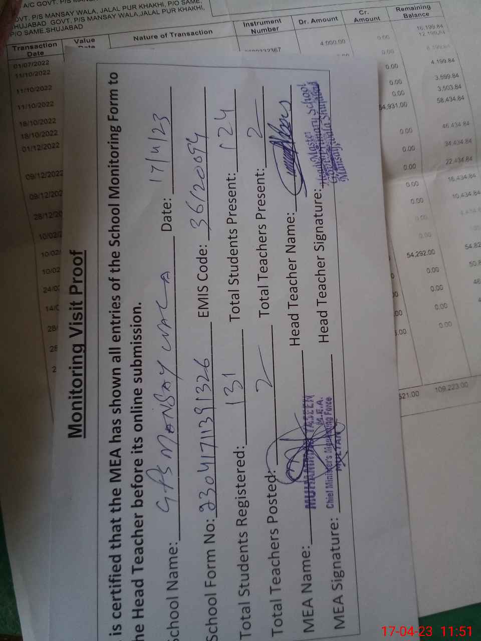 | Attendance Register | Head Teacher | MEA with School | Visit Proof |