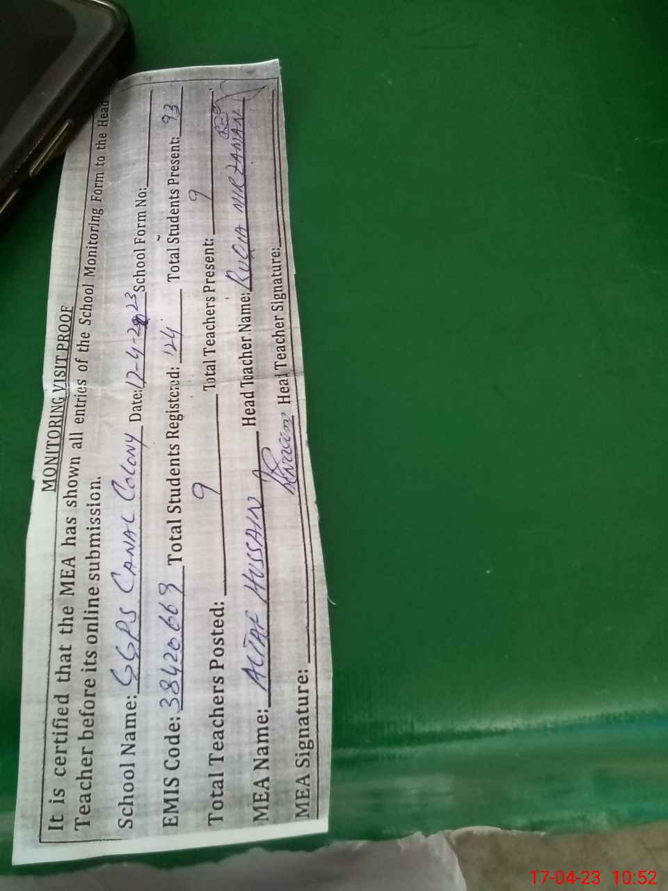 | Attendance Register | Head Teacher | MEA with School | Visit Proof |