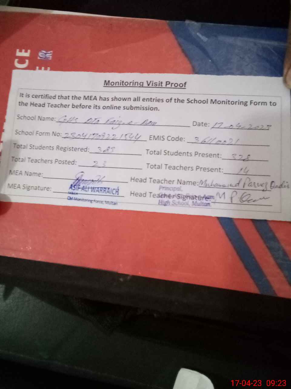 | EMIS Code: 36110021 | Name of School: GHS ATTA FAIZ-E-AAM MULTAN NEAR T.V. BOOSTER | |||