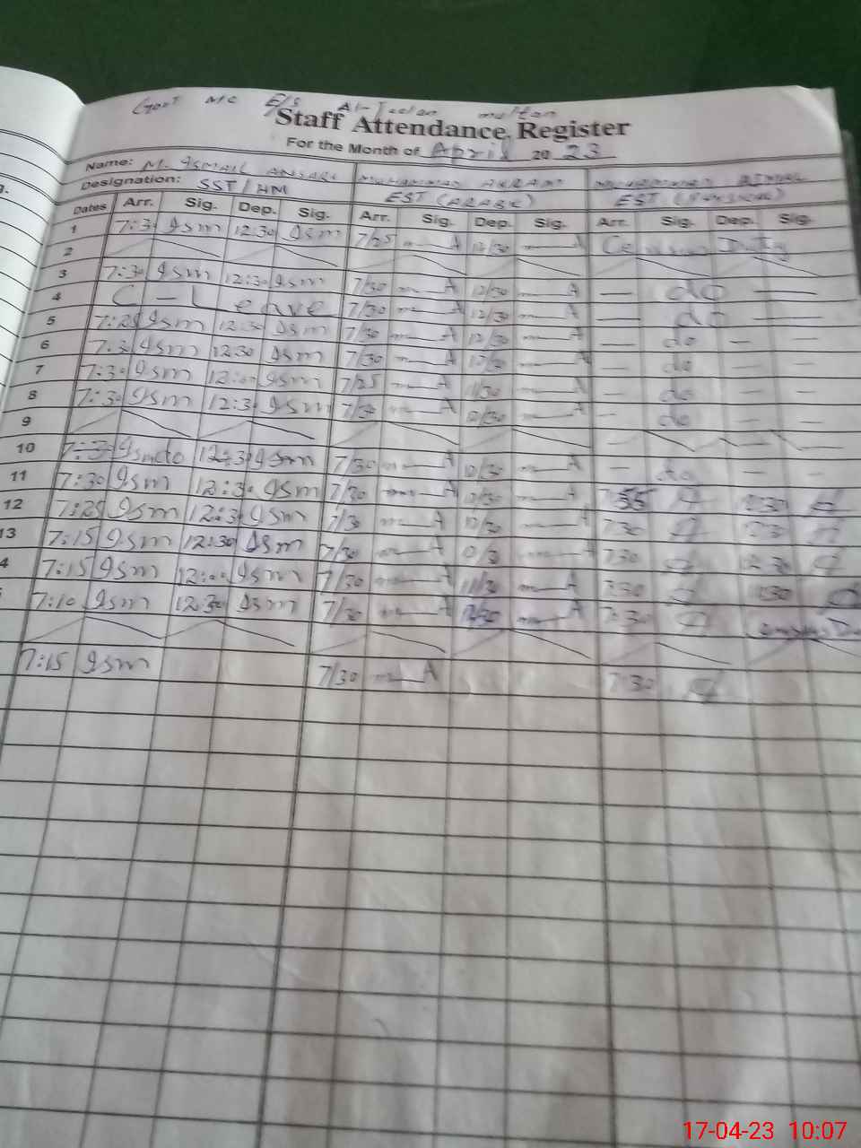 | Monitoring Date: 17-04-2023 | Start Time: 17-04-2023 09:40 AM | End Time: 17-04-2023 10:09 AM | Name of MEA: As**** Al**** | |