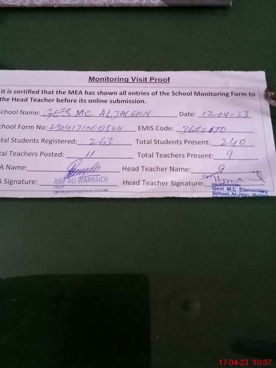 | Attendance Register | Head Teacher | MEA with School | Visit Proof |