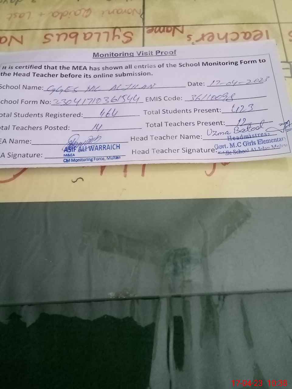 | EMIS Code: 36110098 | Name of School: GGES MC AL-JEELAN MULTAN | |||