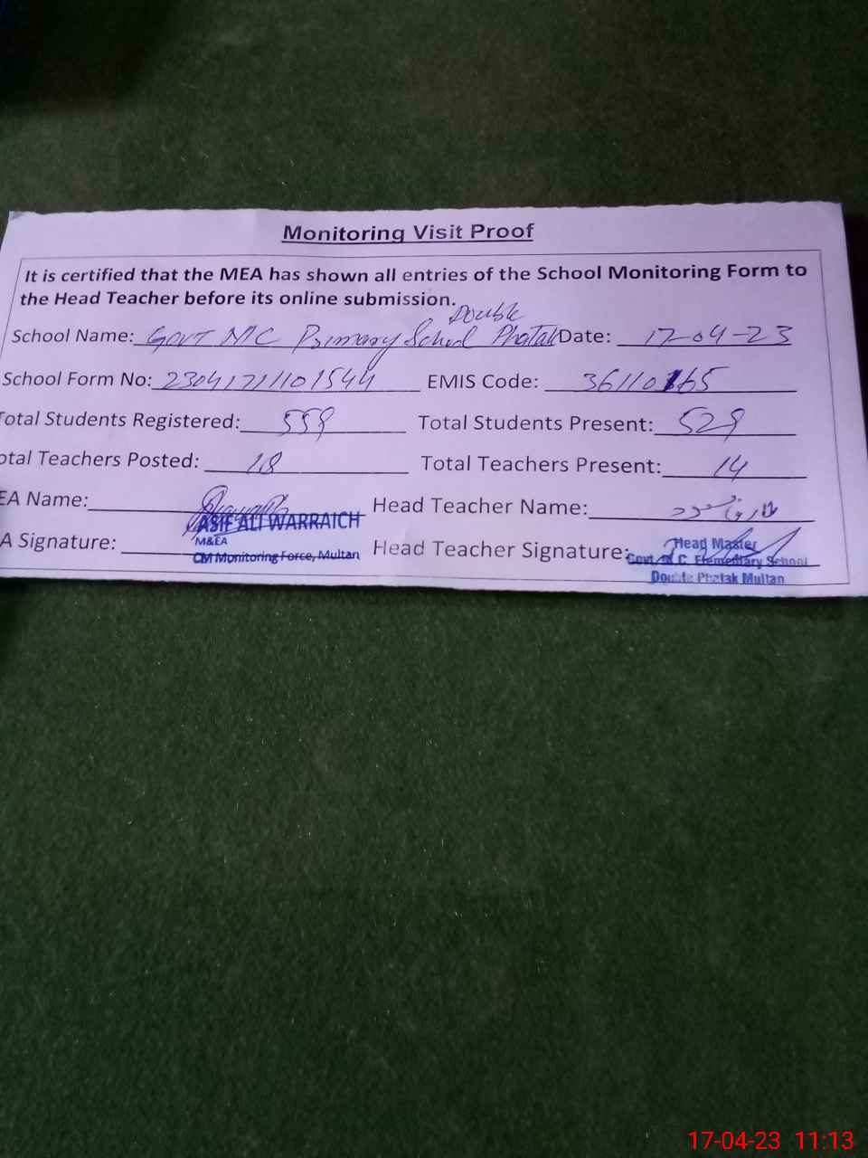| Attendance Register | Head Teacher | MEA with School | Visit Proof |