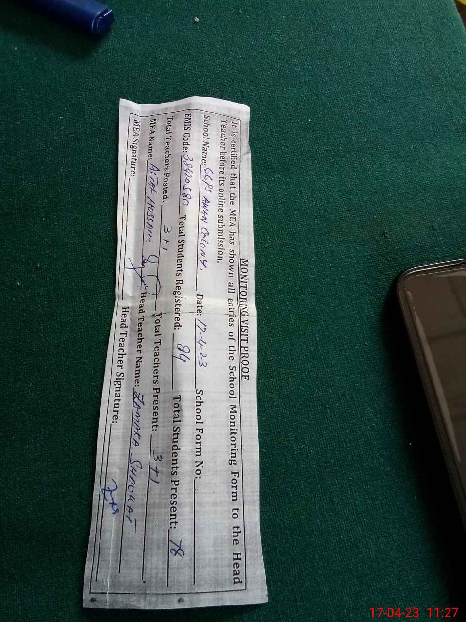 | Attendance Register | Head Teacher | MEA with School | Visit Proof |