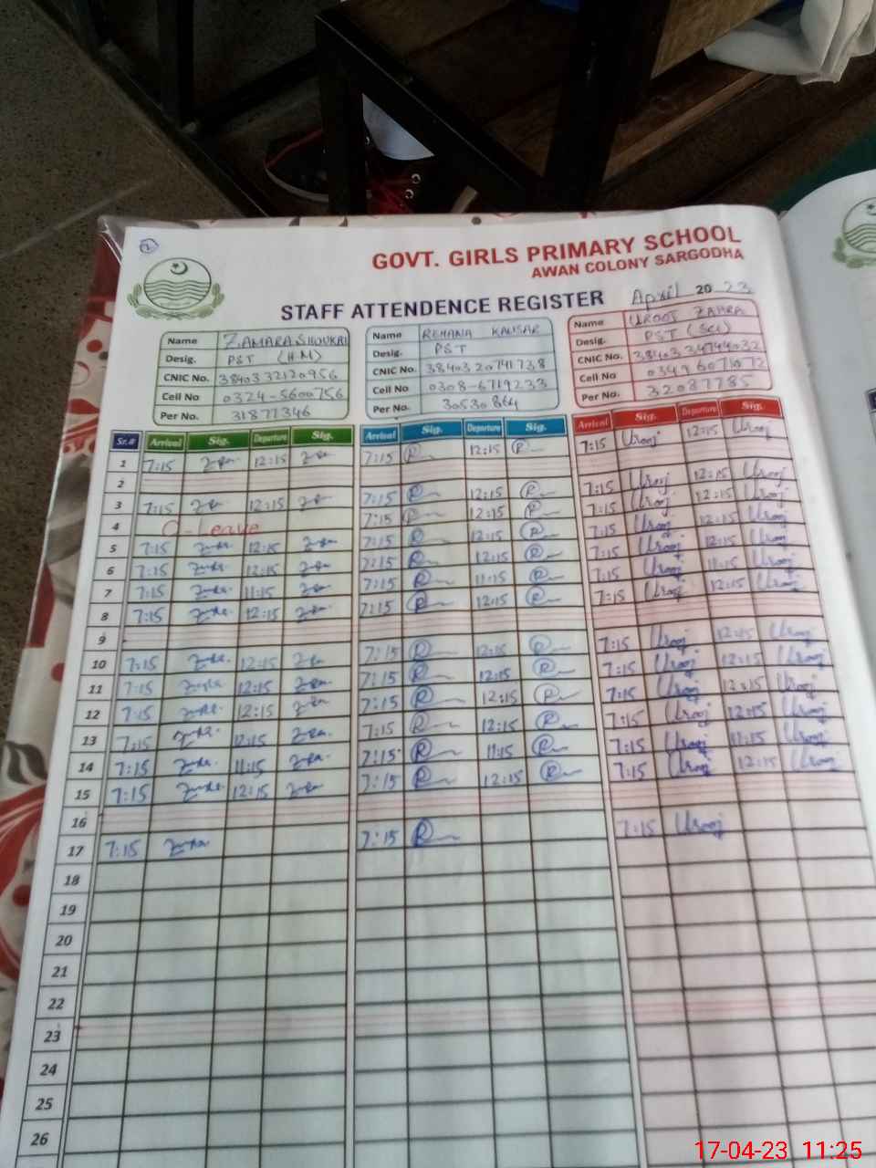 | CNIC | Full Name | Designation | R/C | Absence during last cal. month |