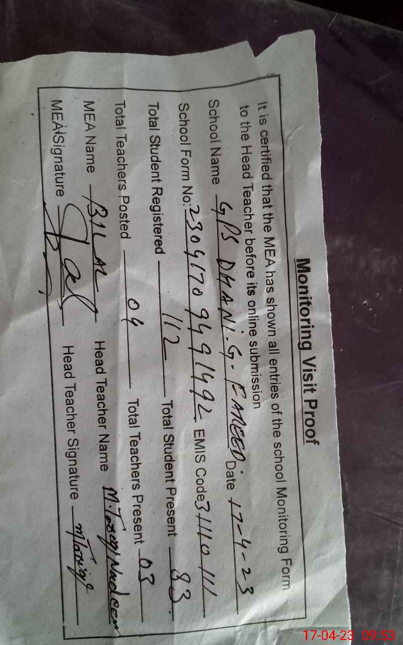 | Attendance Register | Head Teacher | MEA with School | Visit Proof |