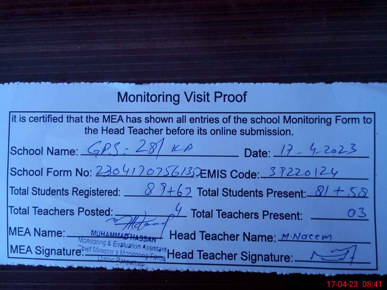 | Attendance Register | Head Teacher | MEA with School | Visit Proof |