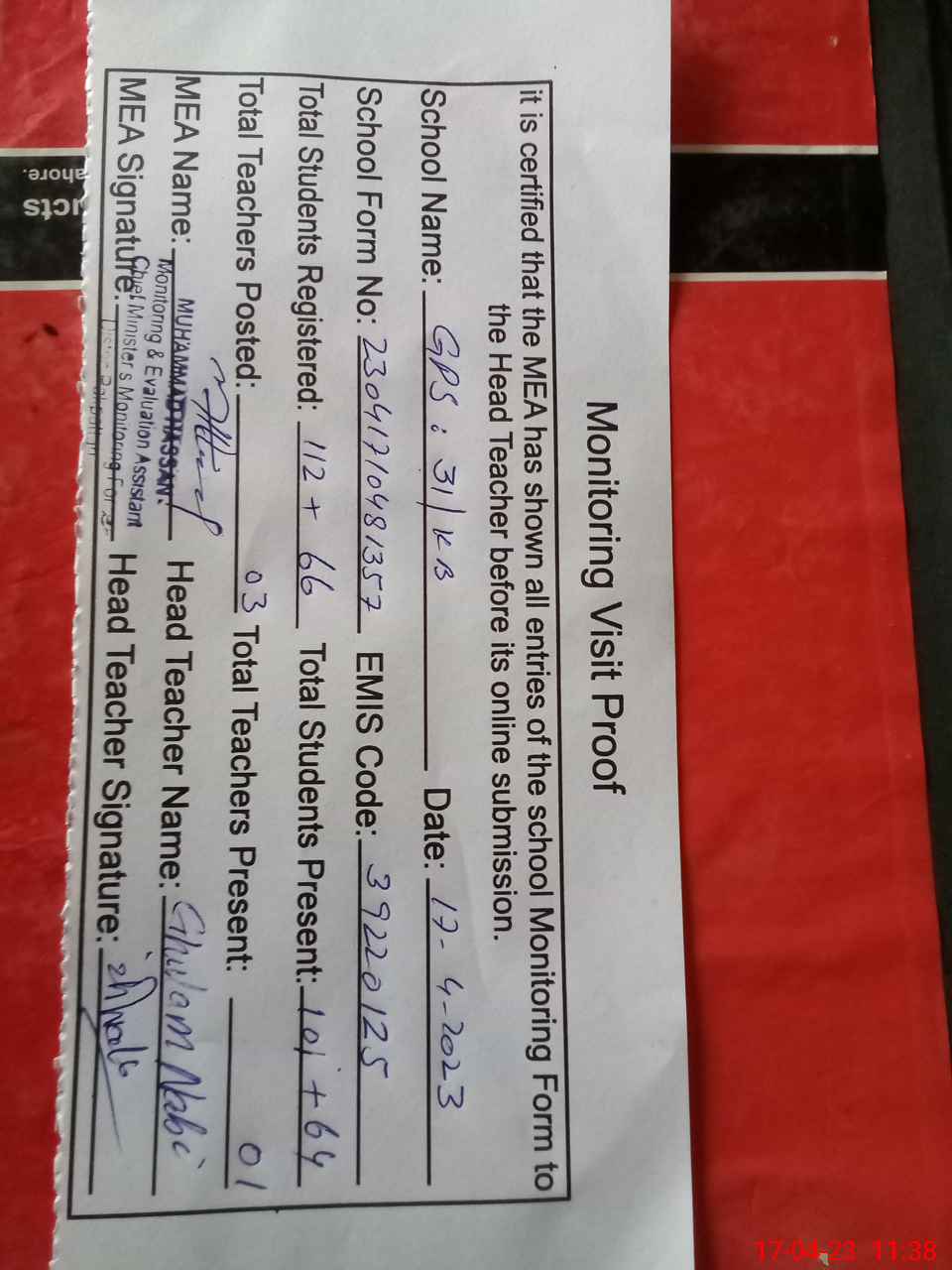 | Attendance Register | Head Teacher | MEA with School | Visit Proof |
