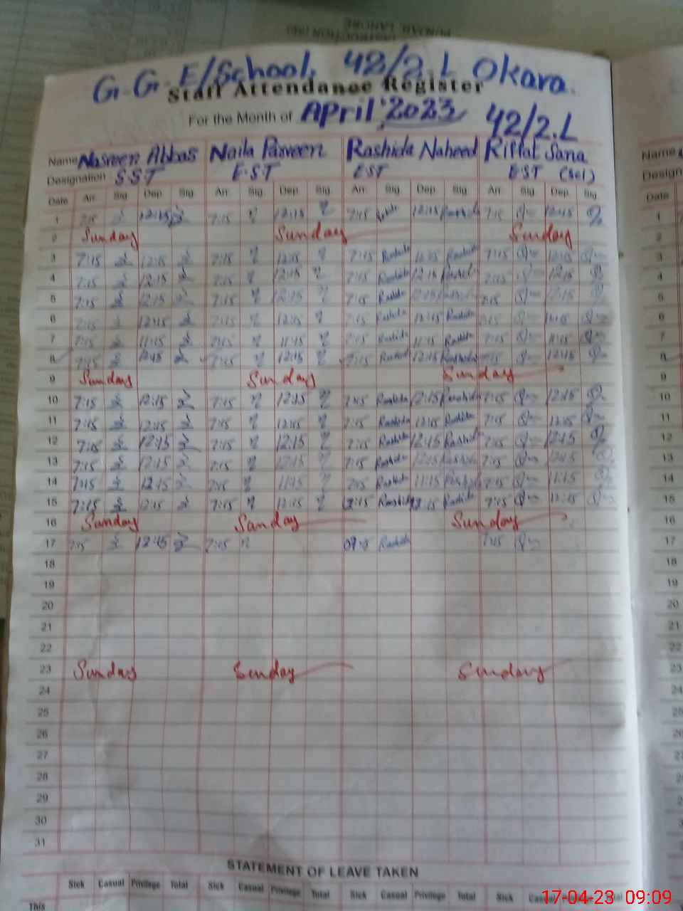 | District: OKARA | Tehsil: OKARA | Markaz: 4/4.L-FEMALE | Level: Middle | |