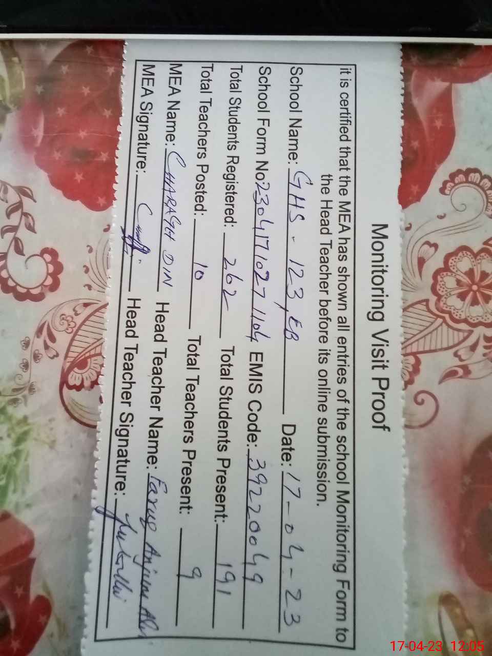 | EMIS Code: 39220049 | Name of School: GHS 123/EB P/O 121/EB ARIF WALA | |||