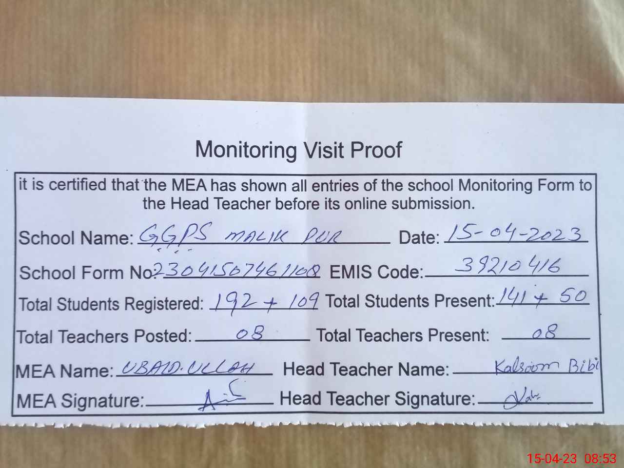 | EMIS Code: 39210416 | Name of School: GGPS MALIK PUR | |||