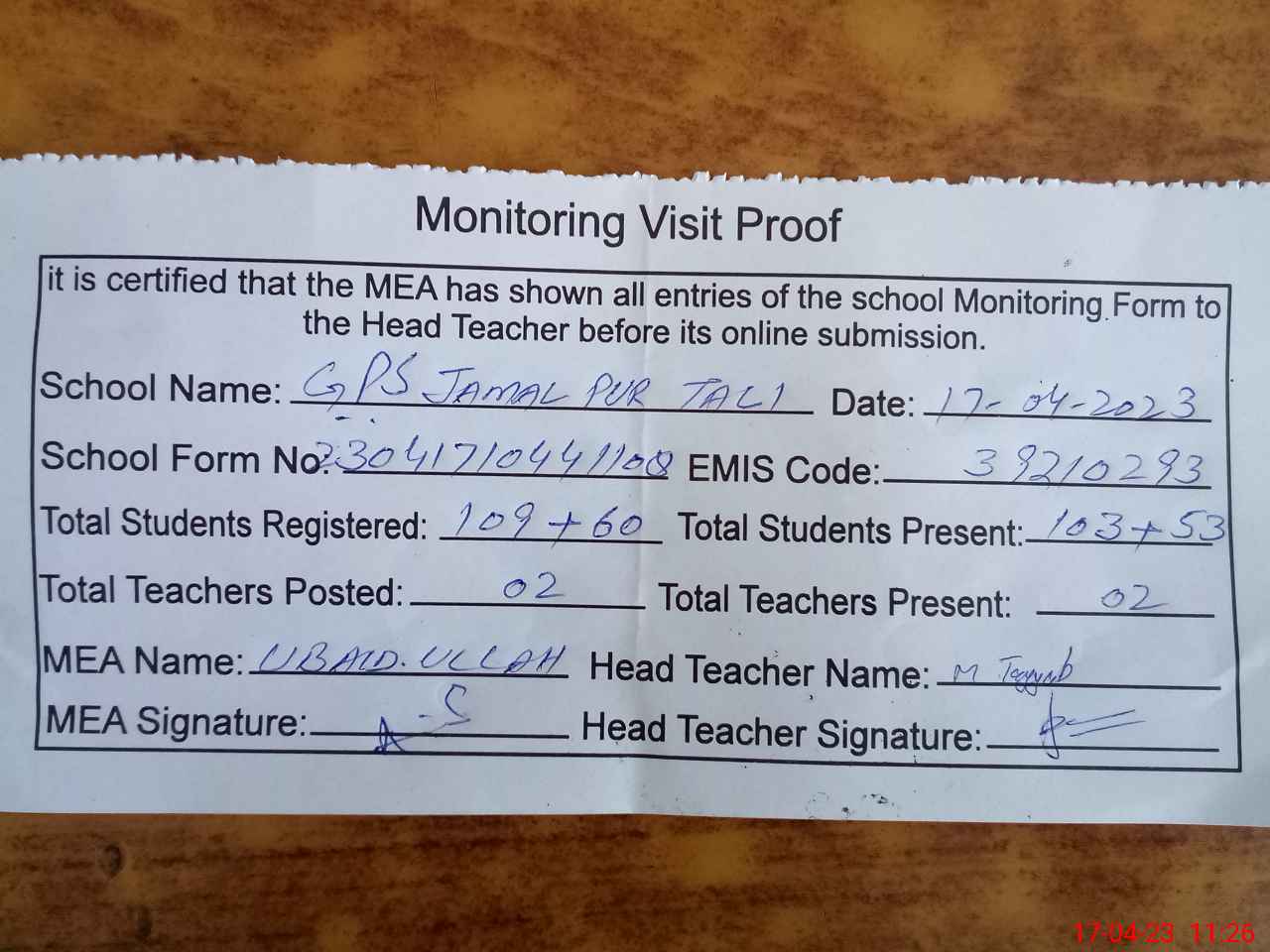 | Attendance Register | Head Teacher | MEA with School | Visit Proof |