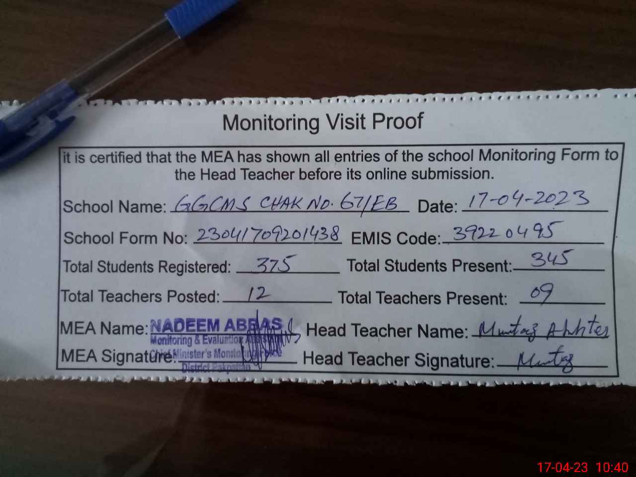 | Attendance Register | Head Teacher | MEA with School | Visit Proof |