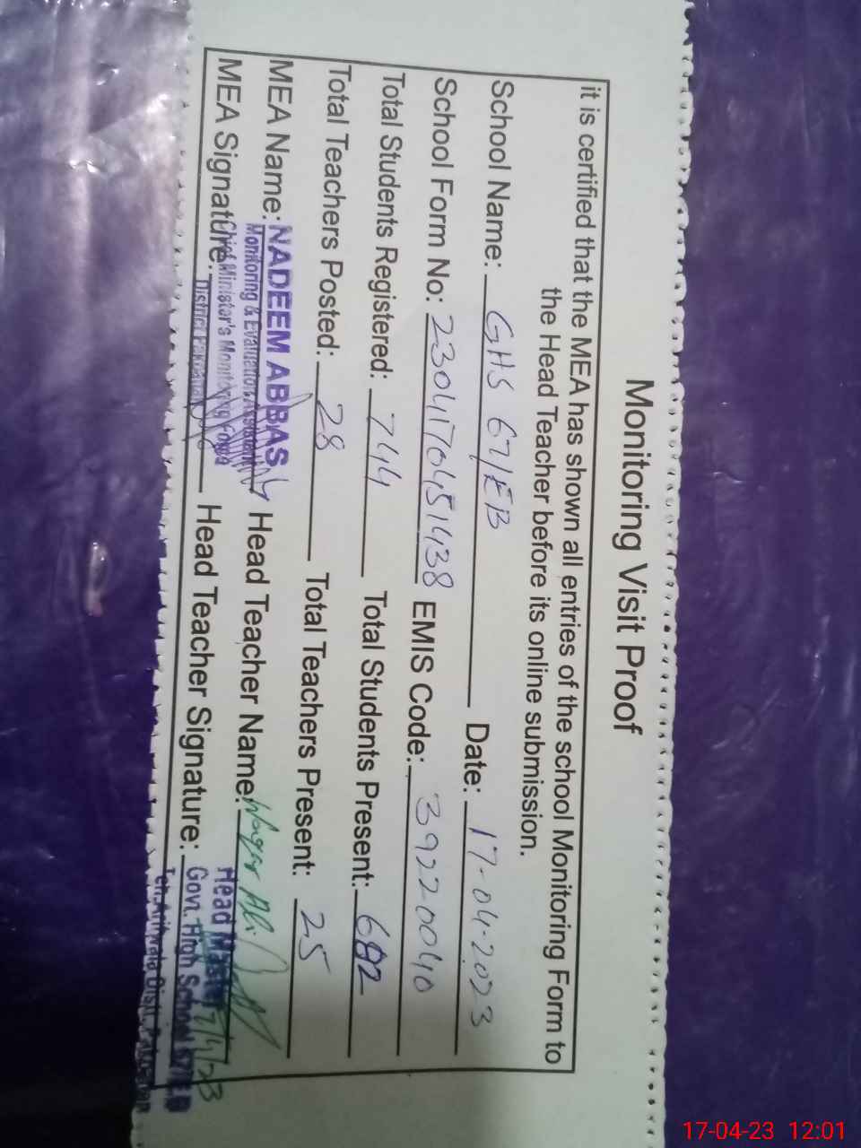 | Attendance Register | Head Teacher | MEA with School | Visit Proof |