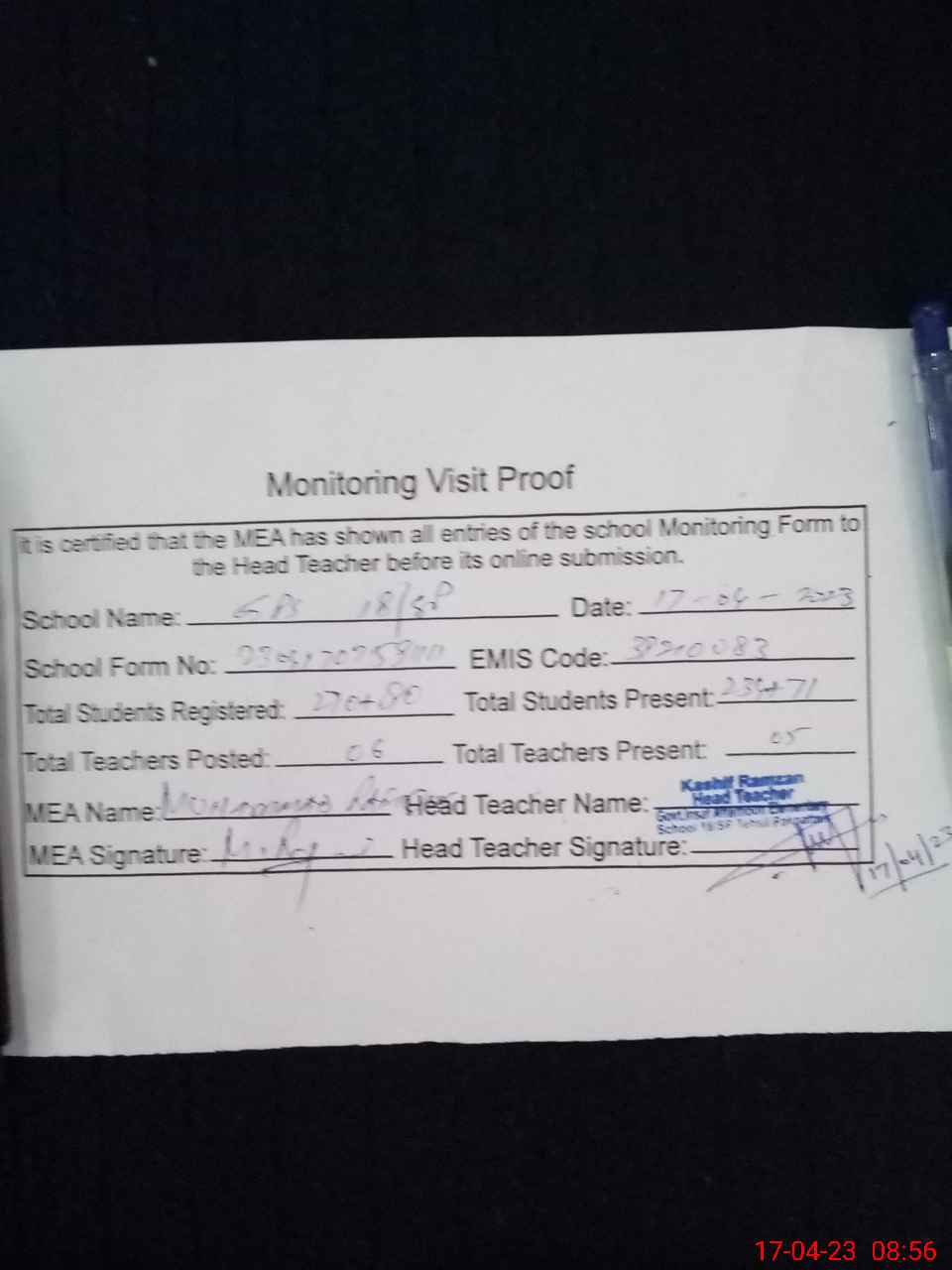 | Attendance Register | Head Teacher | MEA with School | Visit Proof |