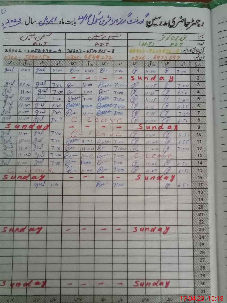 | CNIC | Full Name | Designation | R/C | Absence During Last Calender Month |
