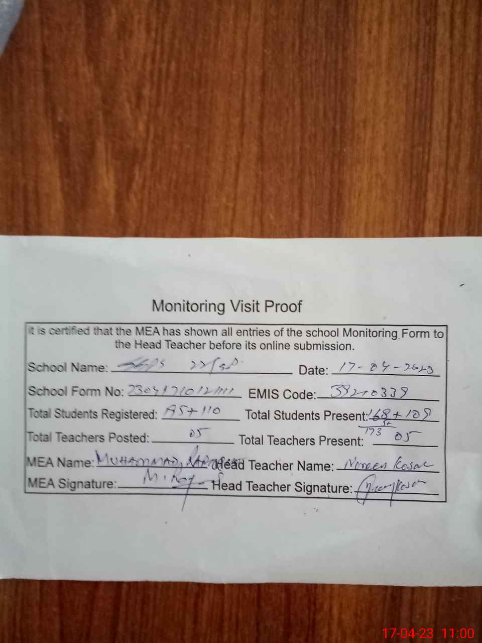 | Attendance Register | Head Teacher | MEA with School | Visit Proof |
