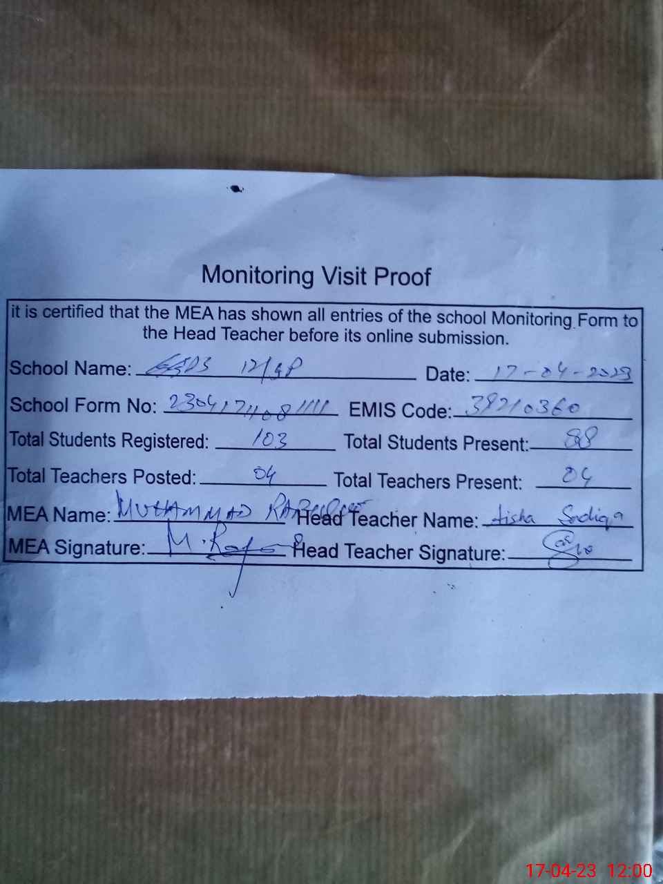 | Attendance Register | Head Teacher | MEA with School | Visit Proof |