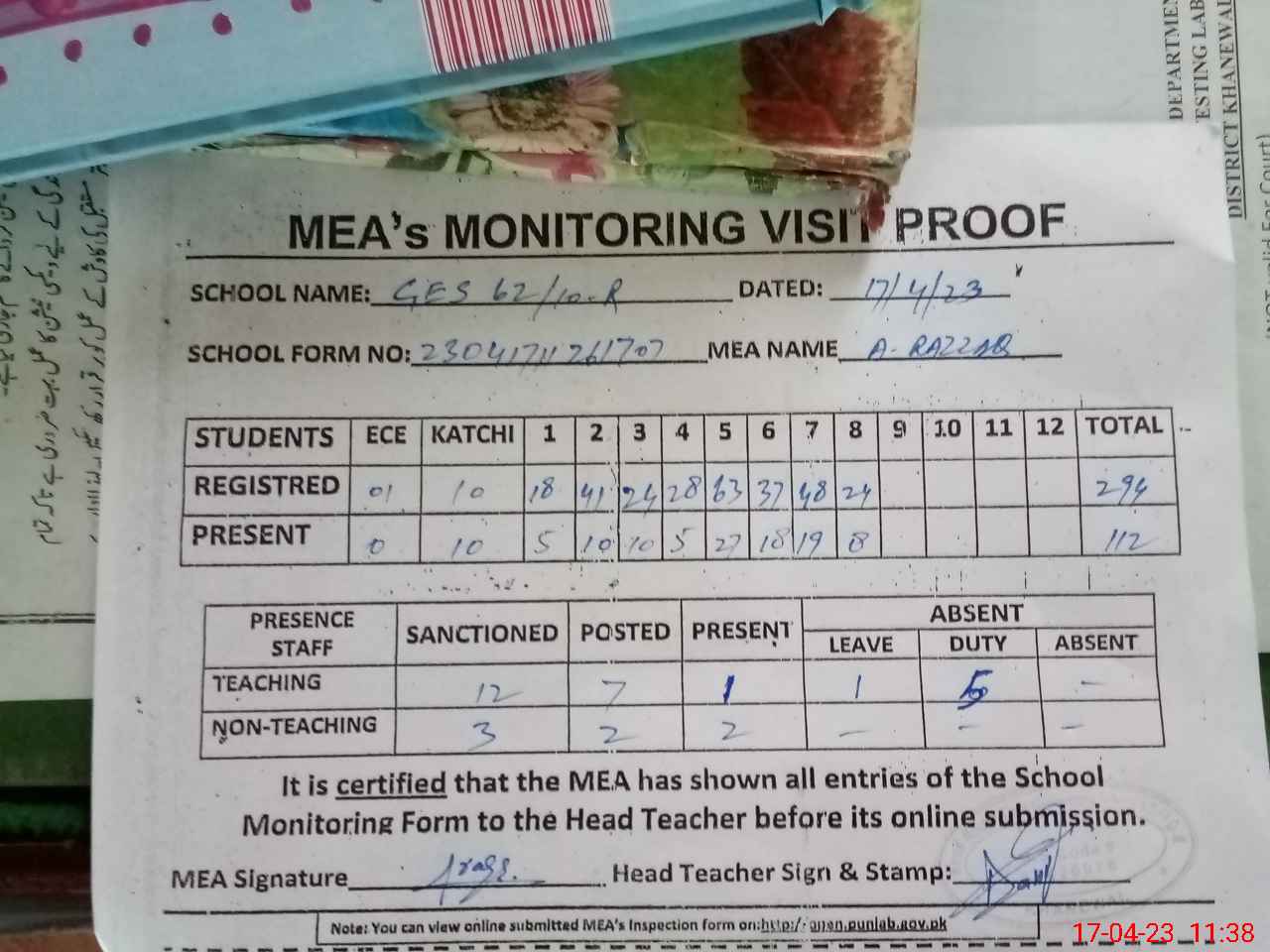 | Attendance Register | Head Teacher | MEA with School | Visit Proof |