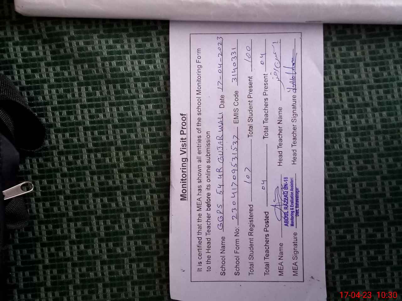 | Attendance Register | Head Teacher | MEA with School | Visit Proof |