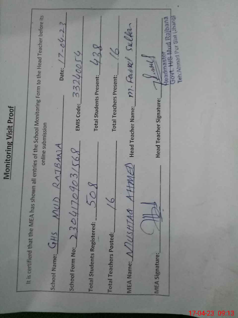 | Attendance Register | Head Teacher | MEA with School | Visit Proof |
