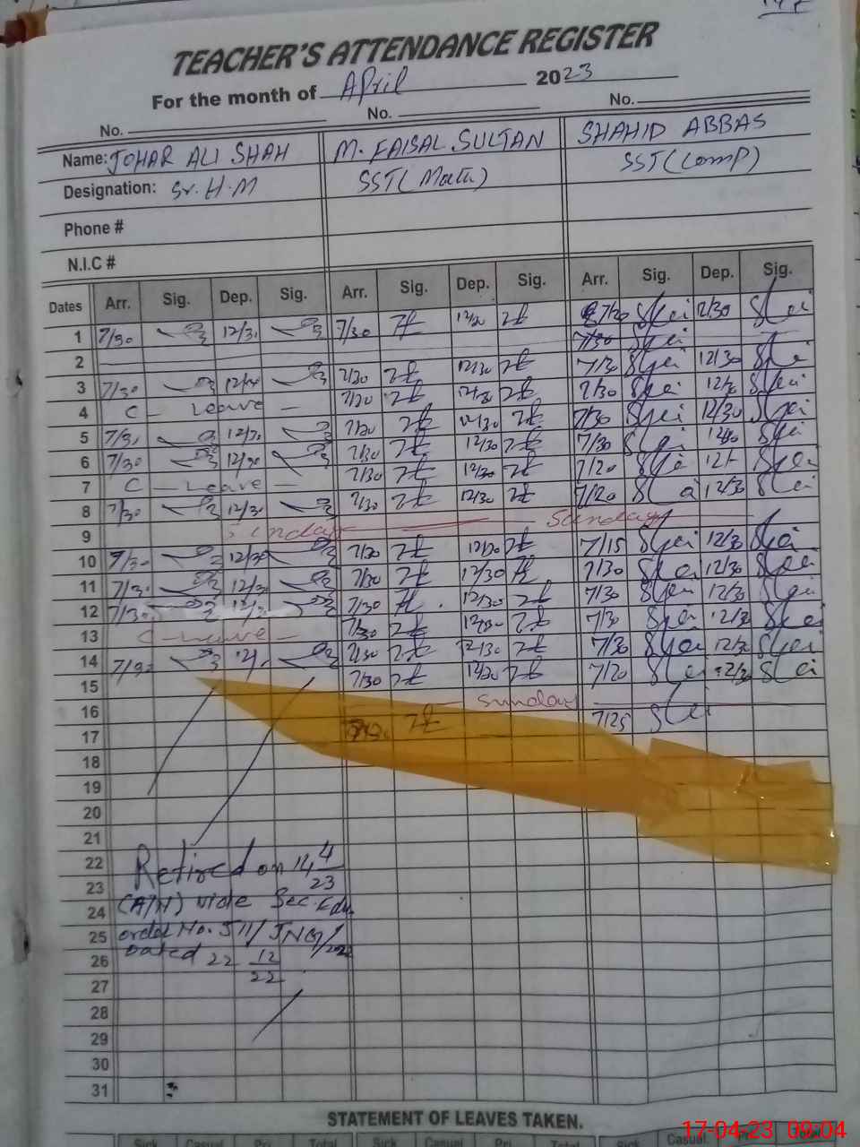 | CNIC | Full Name | Designation | R/C | Absence During Last Calender Month |