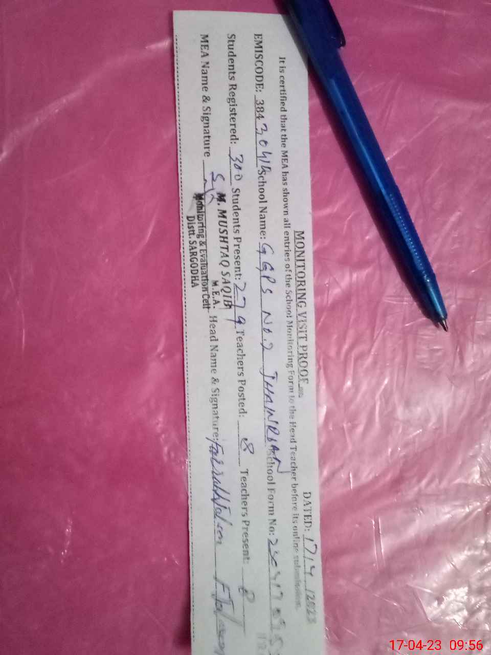 | Attendance Register | Head Teacher | MEA with School | Visit Proof |