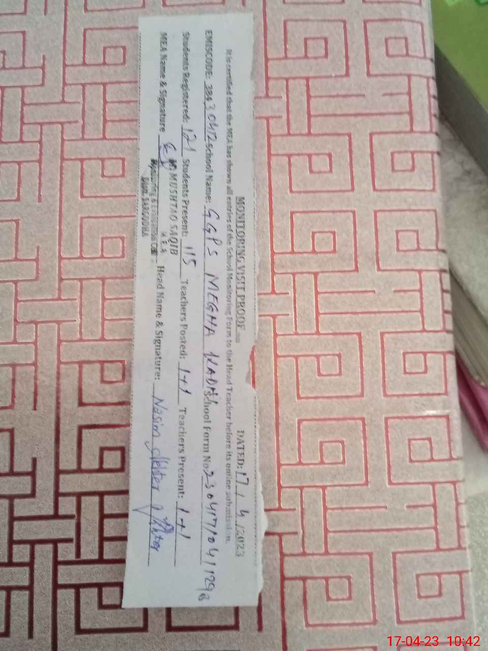 | Attendance Register | Head Teacher | MEA with School | Visit Proof |