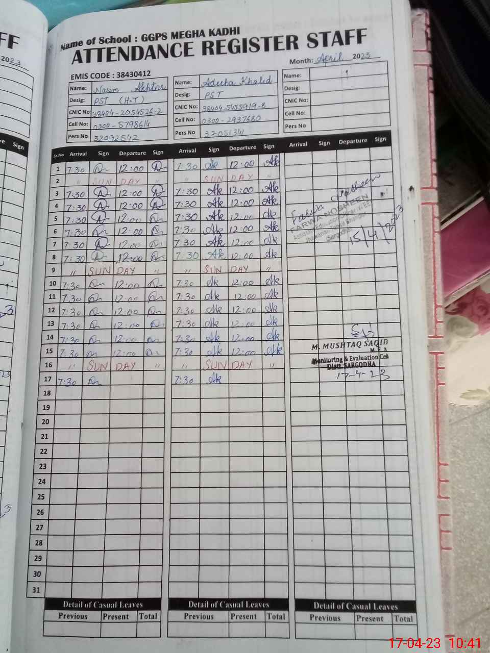 | Name: NA**** AK**** Designation: (School Headmaster's/Headmistress's) ESE (ARTS) Phone/Cell Number: 03**** |