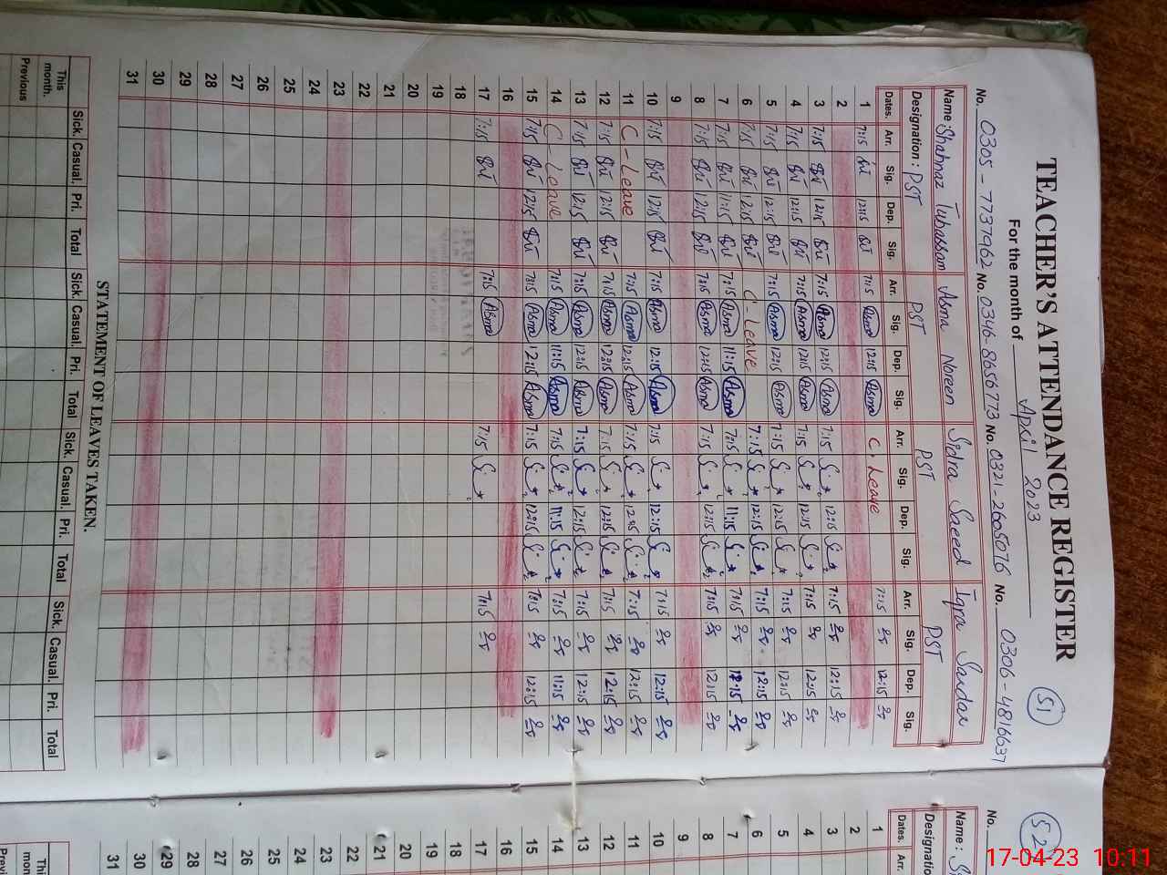 | Name: SI**** SA**** Designation: (School Headmaster's/Headmistress's) PST Phone/Cell Number: 03**** |