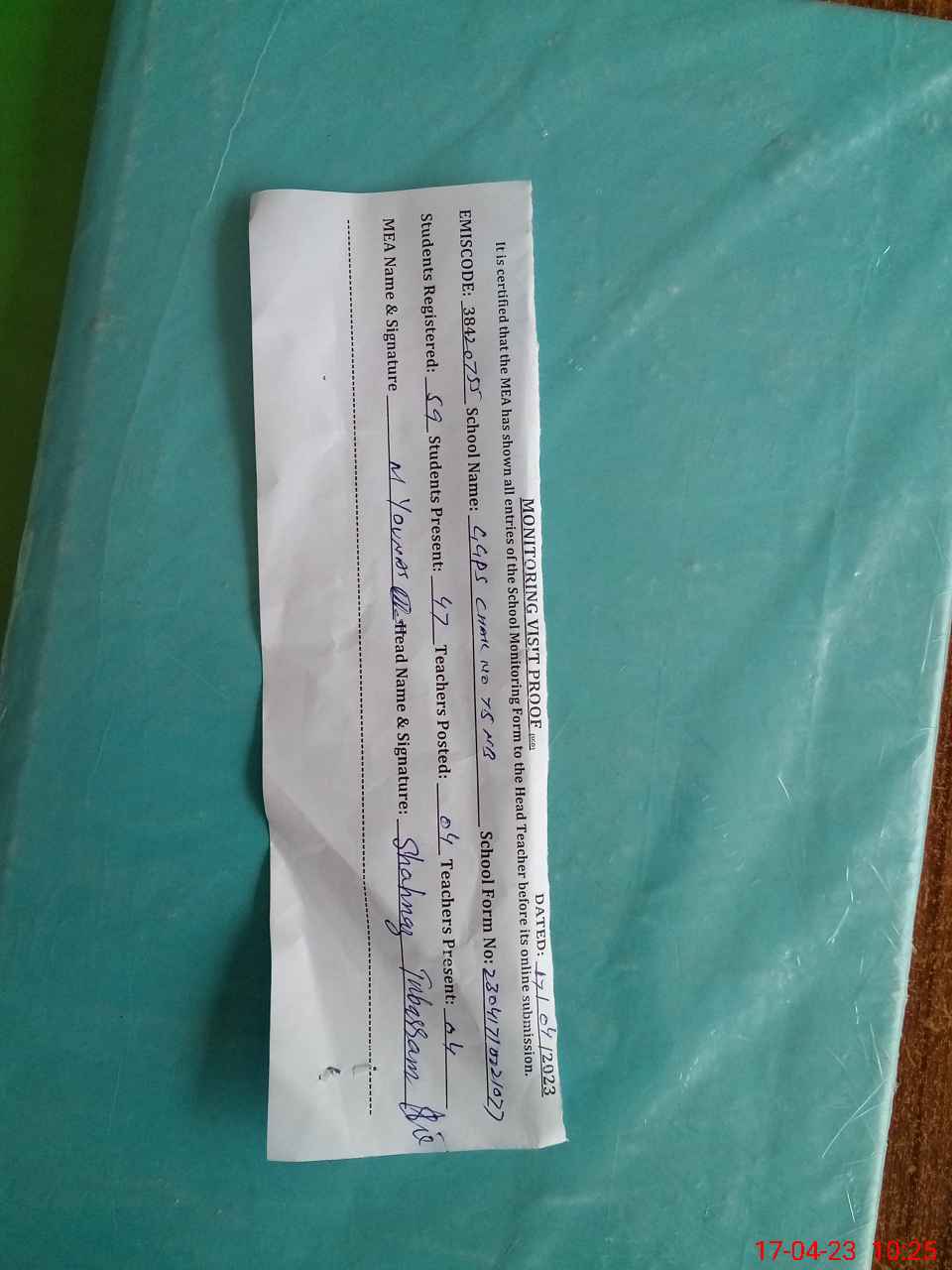 | Attendance Register | Head Teacher | MEA with School | Visit Proof |