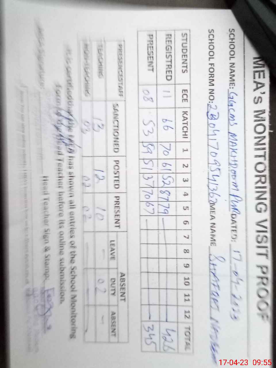 | Attendance Register | Head Teacher | MEA with School | Visit Proof |