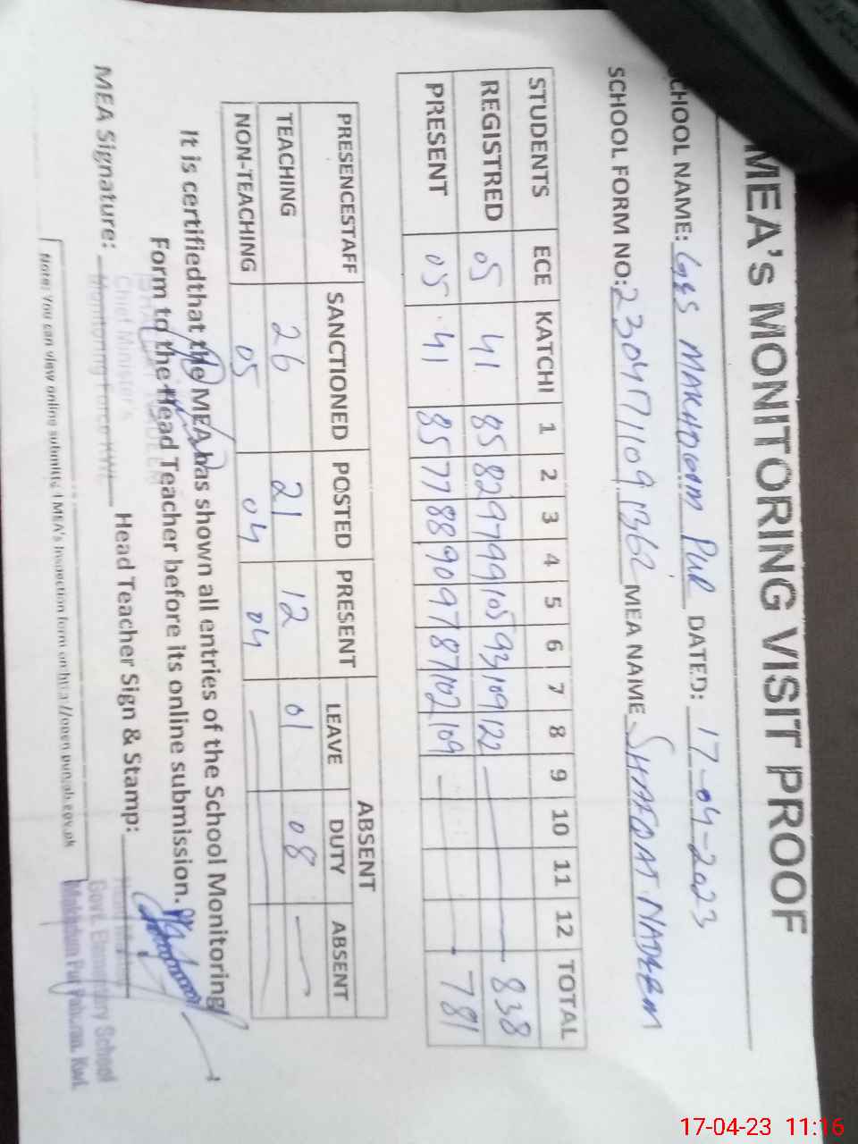 | Attendance Register | Head Teacher | MEA with School | Visit Proof |