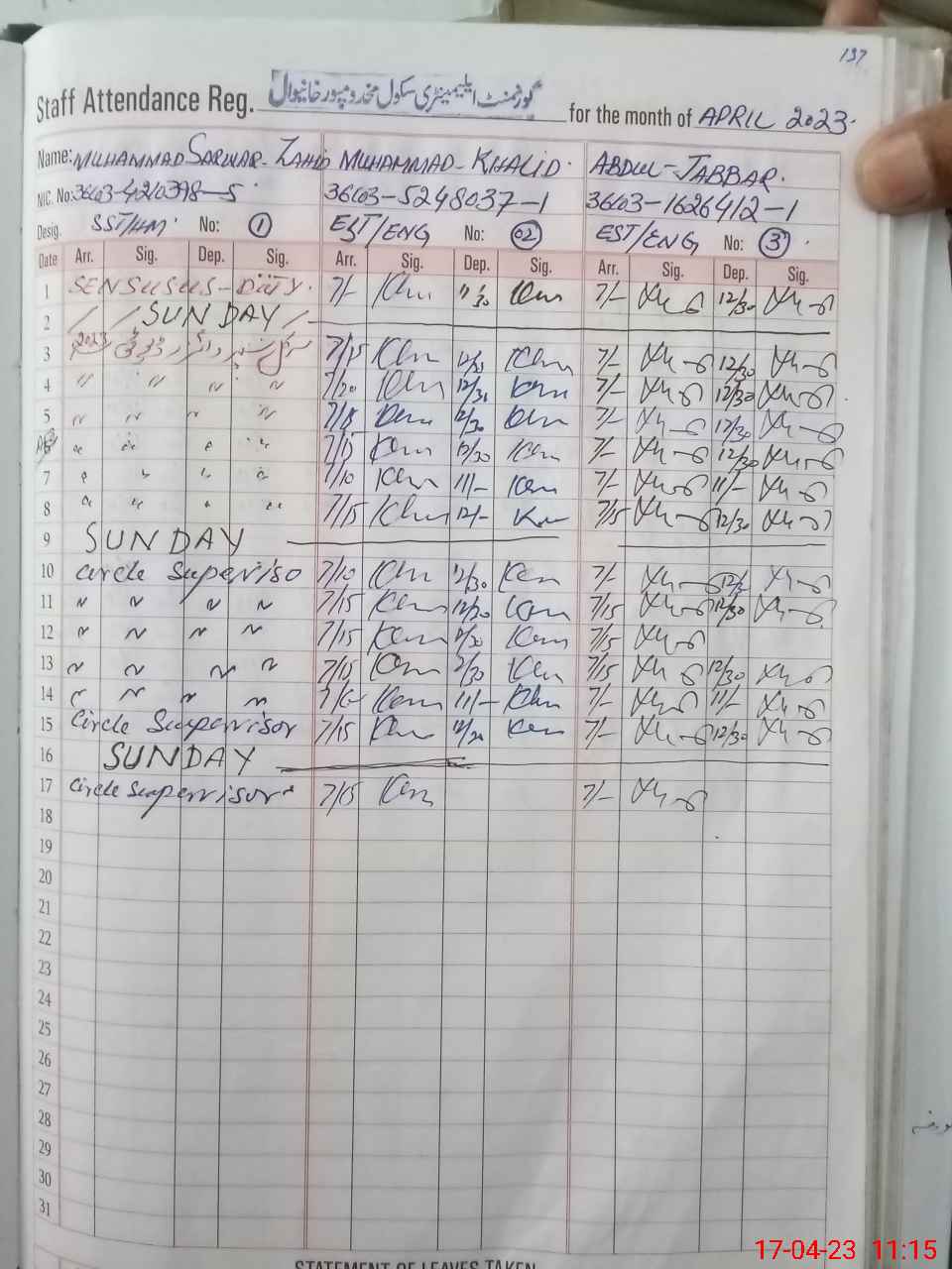 | CNIC | Full Name | Designation | R/C | Absence During Last Calender Month |